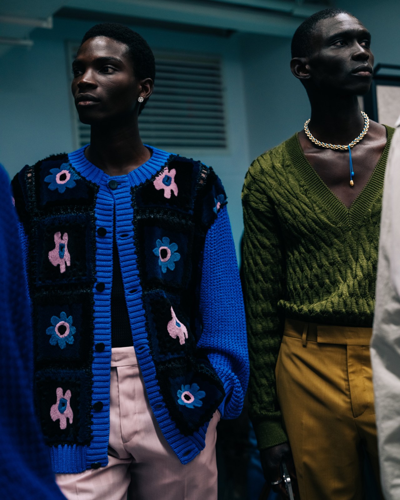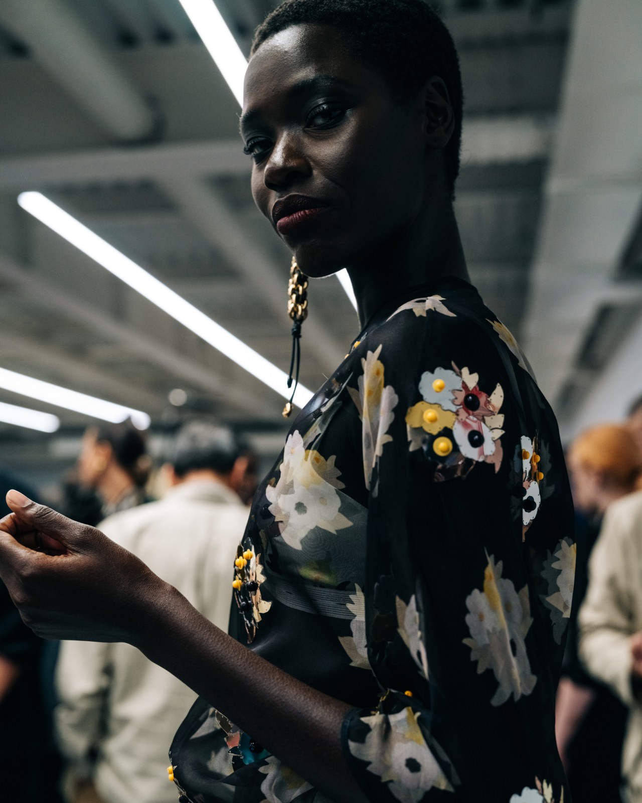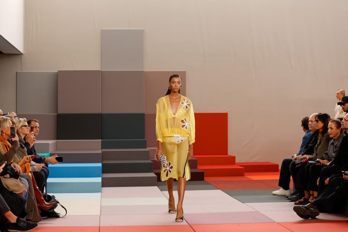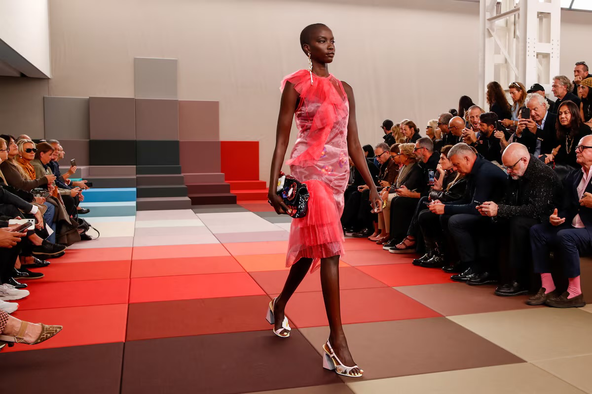 Марк Ньюсон превратил пространство показа в цифровую иллюзию: волнообразный подиум и мозаика из ярких кубов стали частью действа, в котором зрители сами были вовлечены в атмосферу игры. Модели словно шагали по виртуальной реальности, где роскошь теряет границы и превращается в оптический трип.