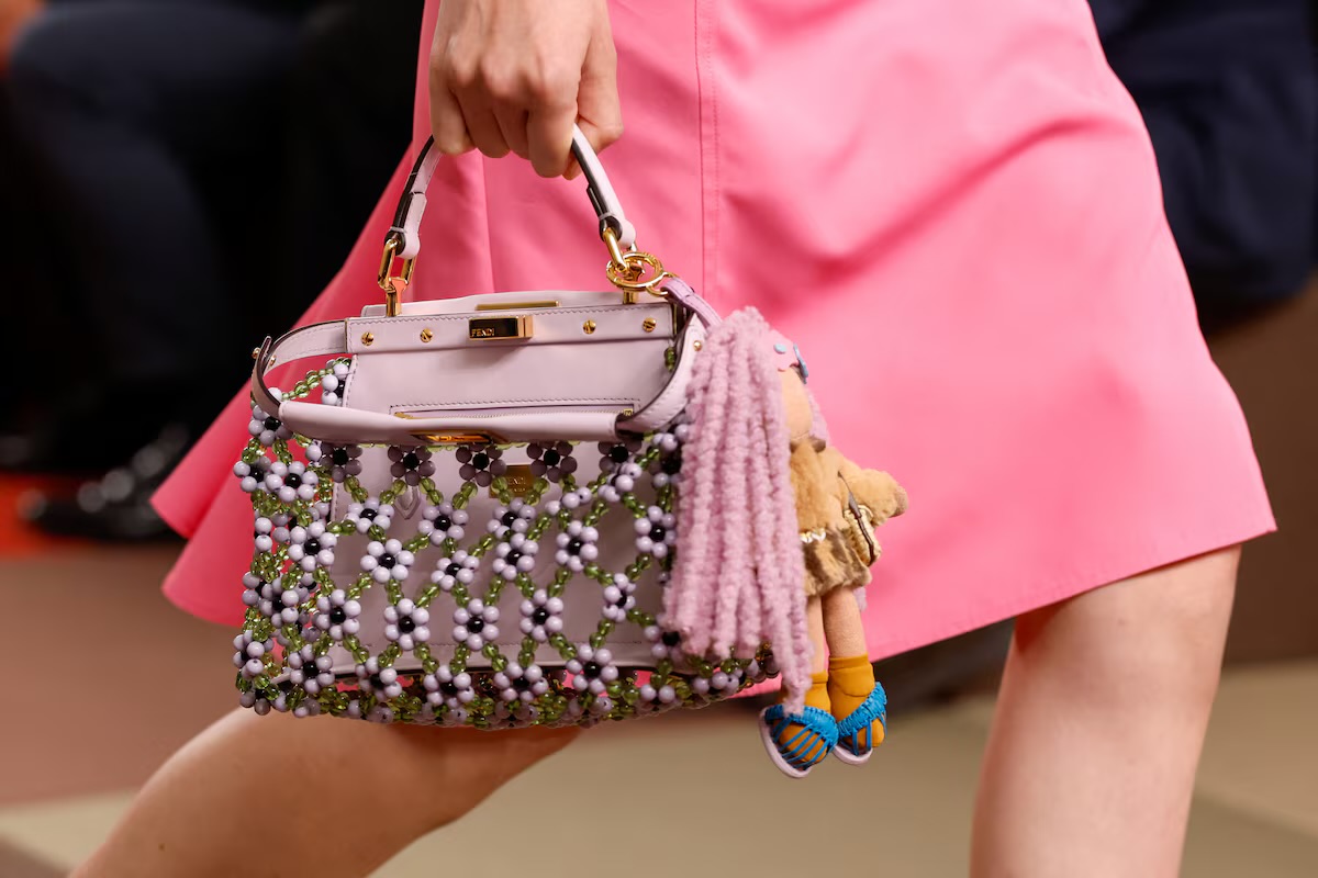 Peekaboo открылась по-новому: с пайетками и вышивками внутри — роскошью, которую можно хранить в секрете. Сумка-чокер Collier, меховые лоферы-сеточки и подвески-яйца добавили коллекции иронии и игривости, подчеркнув, что аксессуар у Fendi — всегда отдельная история.