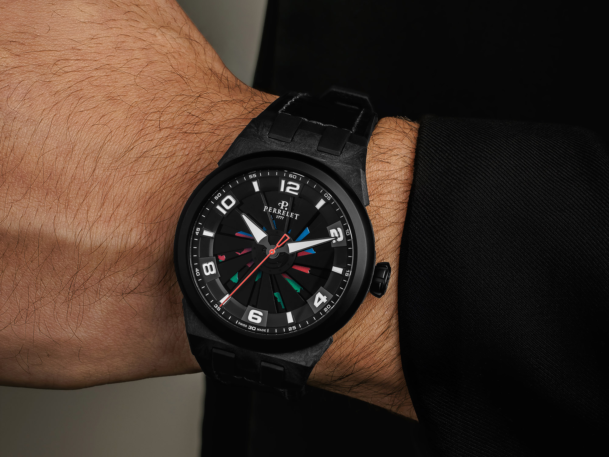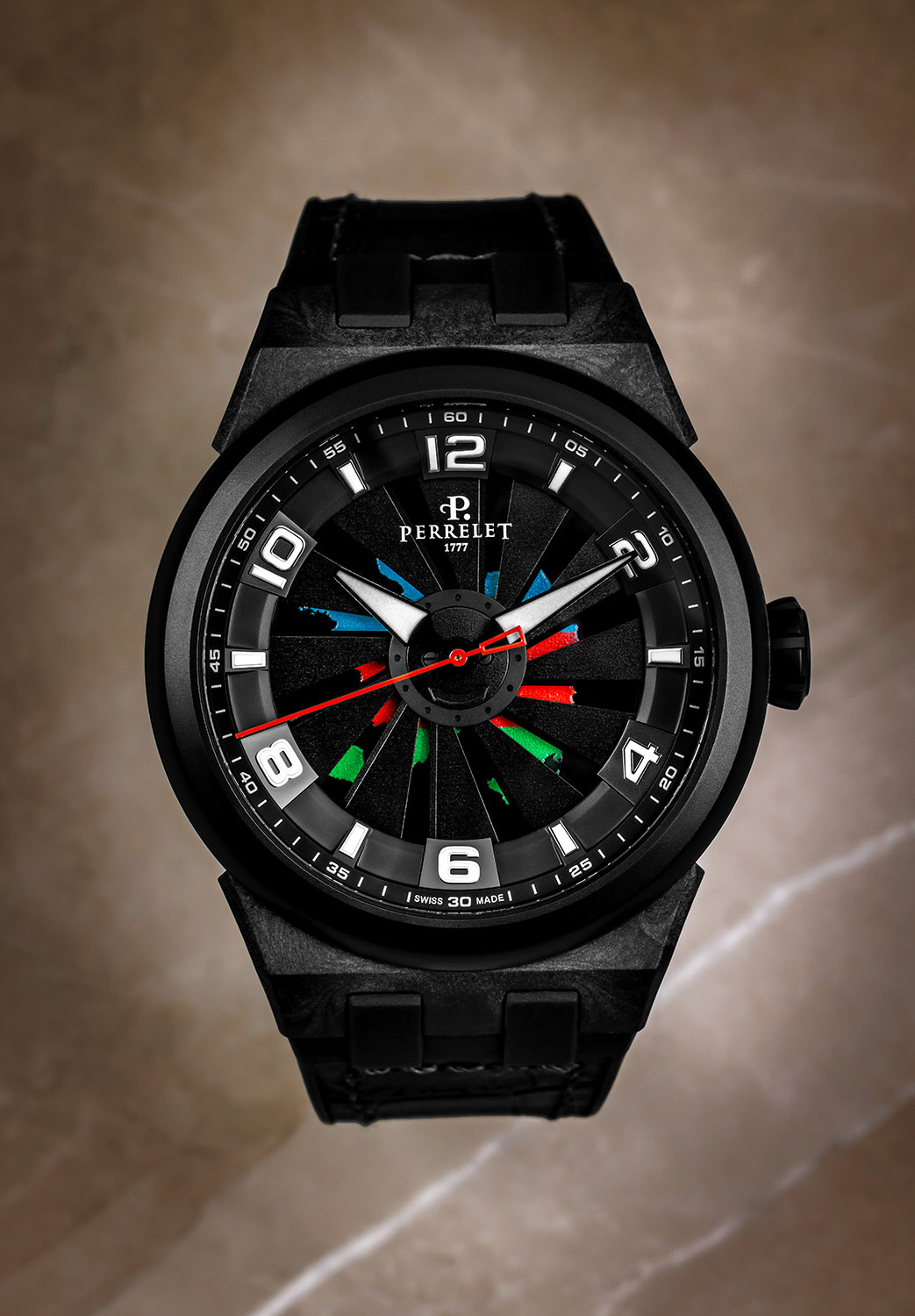 Основанная в 1777 году, мануфактура Perrelet соединяет историческое наследие и инновации. Коллекция Turbine, запатентованная в 2009 году, стала для бренда полем для творческих экспериментов. В новой модели вращающиеся лопасти турбины из чёрного анодированного алюминия открывают изображение флага, создавая эффект динамики и глубины.