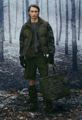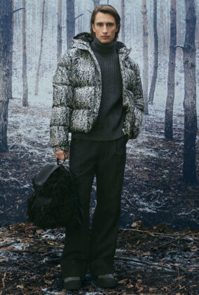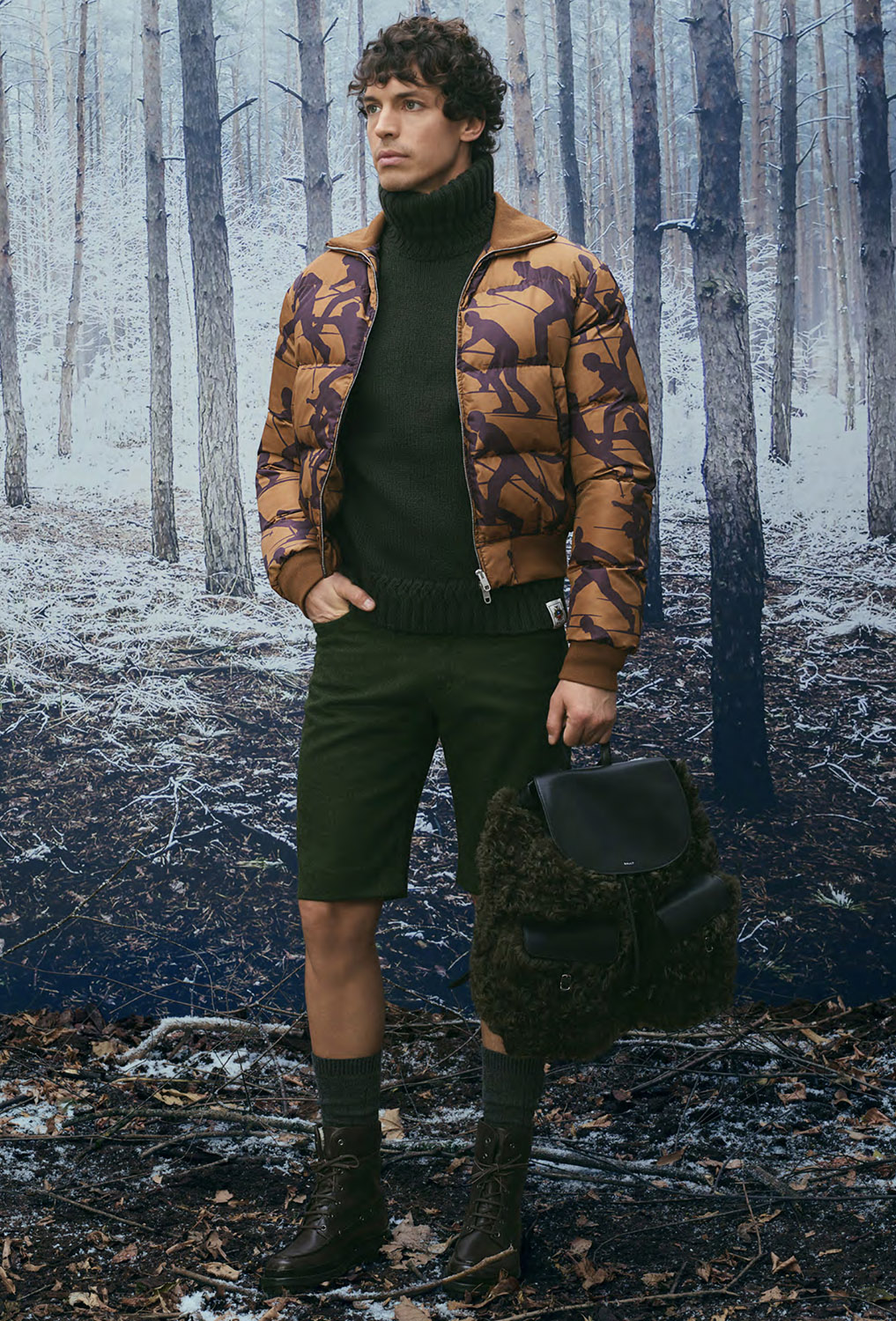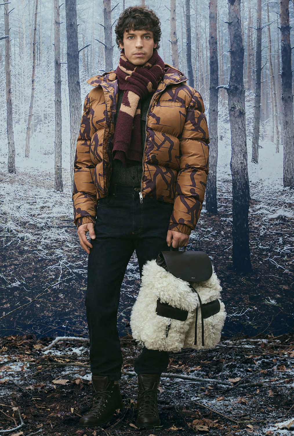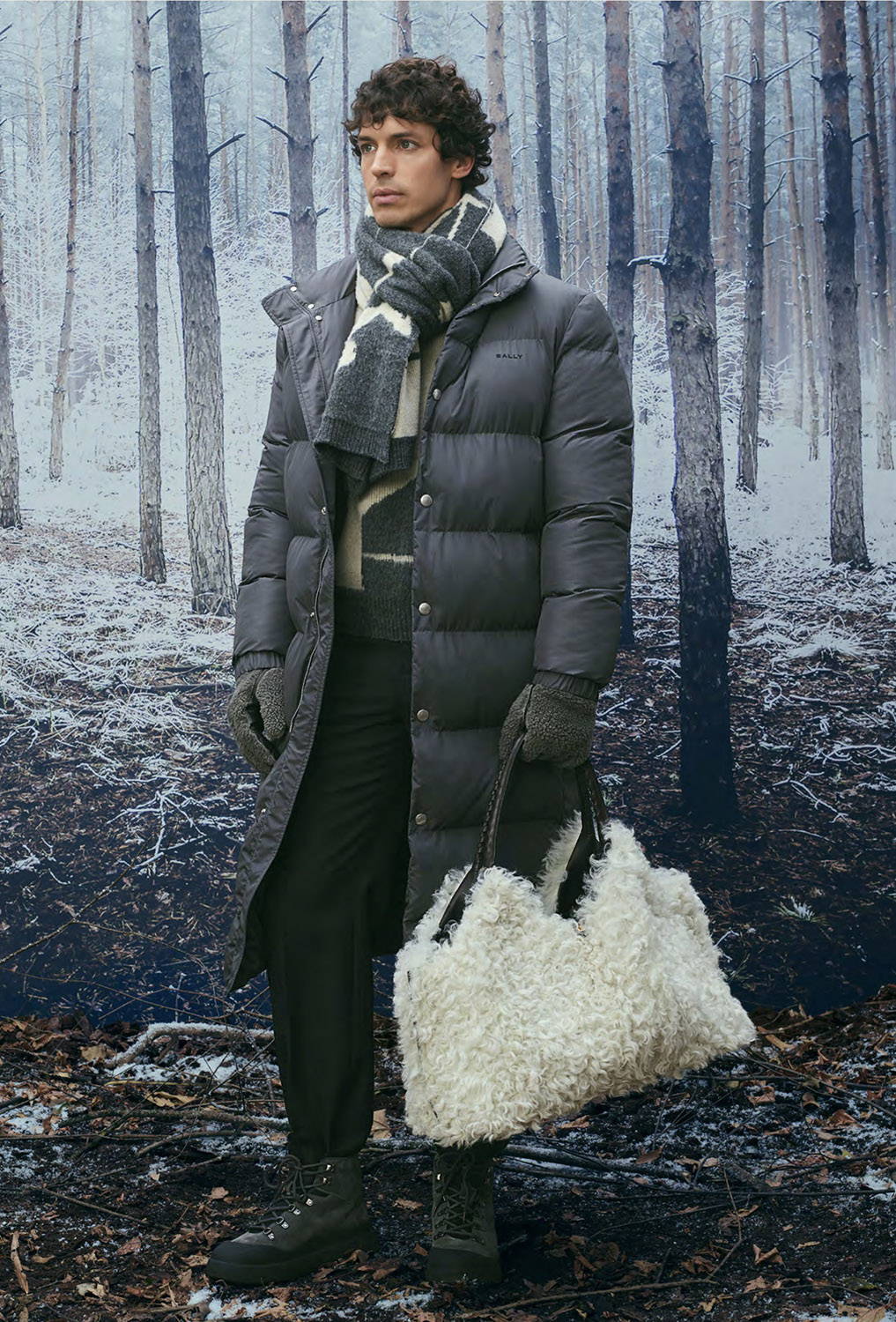 В сезоне осень/зима 2026 Альпы представлены в актуальном прочтении, при этом коллекция остается верной ключевым кодам BALLY. Работа с архивами, визуальными материалами прошлых зимних кампаний и природными мотивами формирует основу принтов, силуэтов и характерных SKI-мотивов. Швейцарские сосны и заснеженные хвойные деревья образуют плотные графические повторения, напоминающие камуфляж, а фирменная буква B появляется в виде стеганого тиснения на сумках, аксессуарах и одежде.