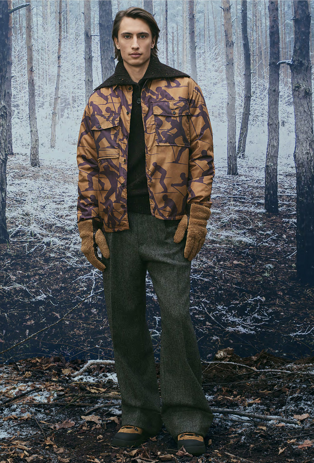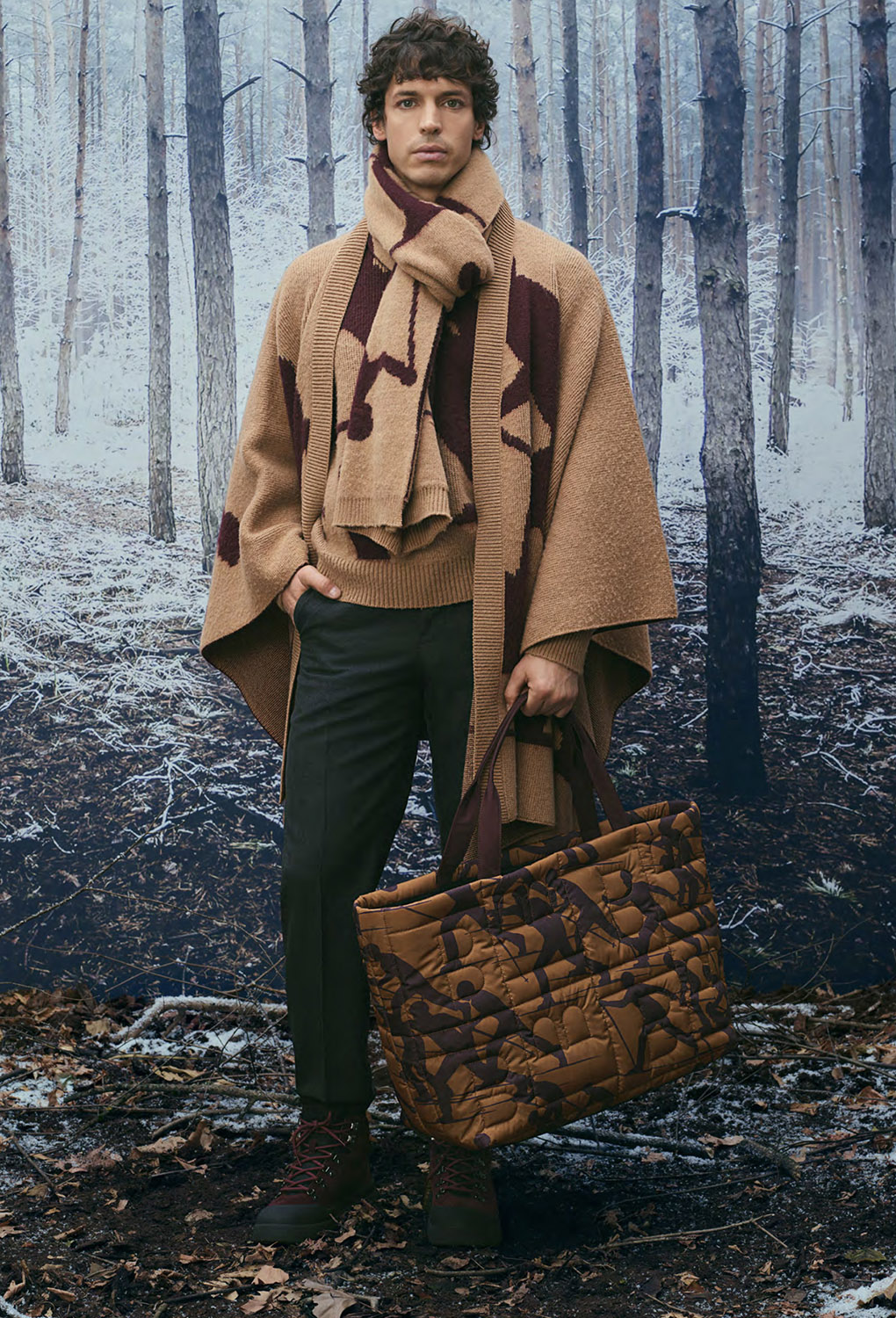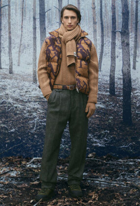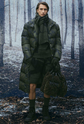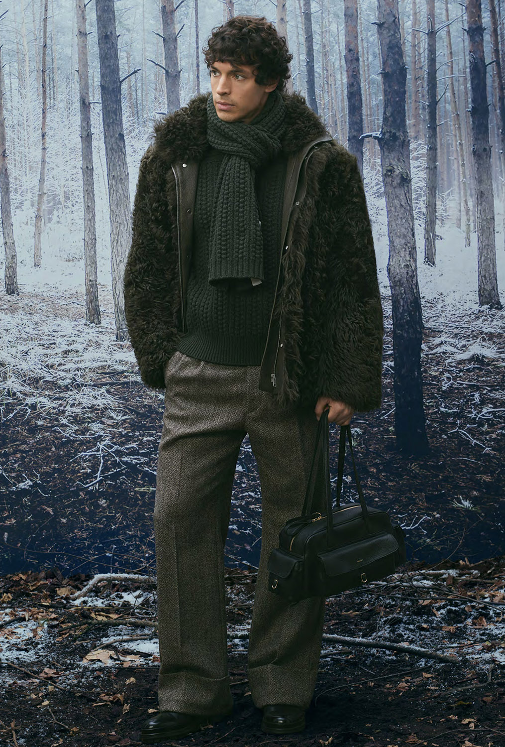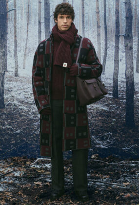 В сезоне осень/зима 2026 Альпы представлены в актуальном прочтении, при этом коллекция остается верной ключевым кодам BALLY. Работа с архивами, визуальными материалами прошлых зимних кампаний и природными мотивами формирует основу принтов, силуэтов и характерных SKI-мотивов. Швейцарские сосны и заснеженные хвойные деревья образуют плотные графические повторения, напоминающие камуфляж, а фирменная буква B появляется в виде стеганого тиснения на сумках, аксессуарах и одежде.