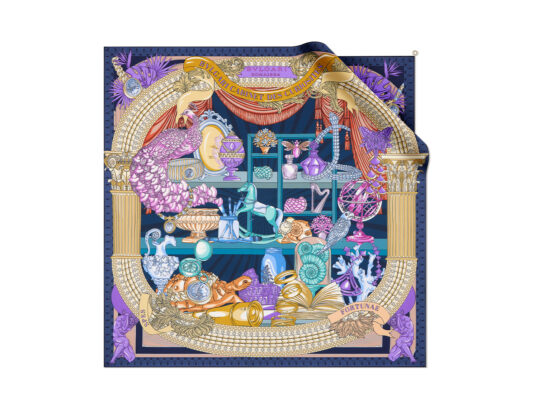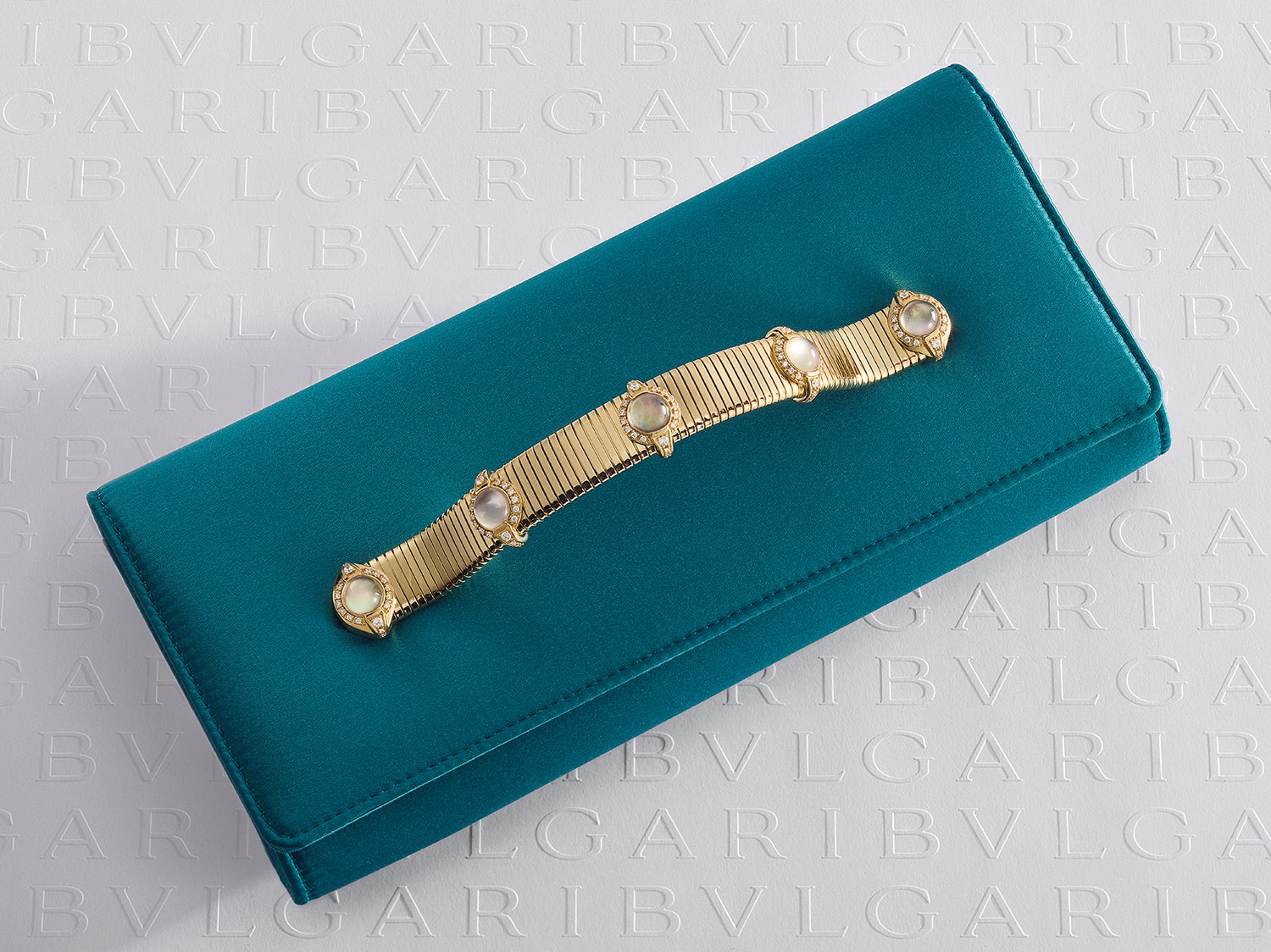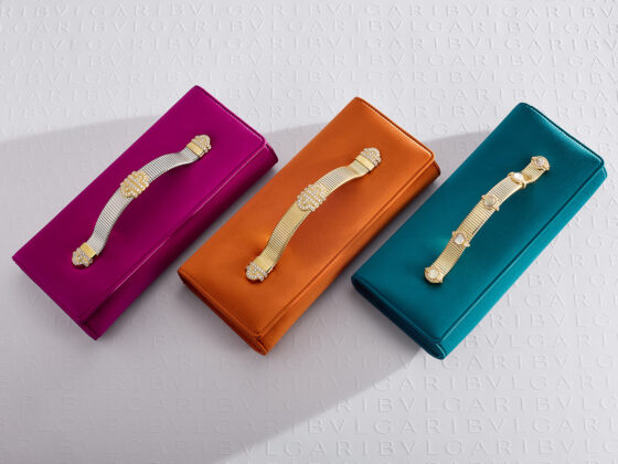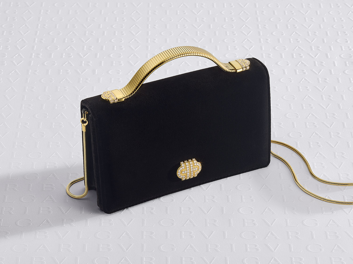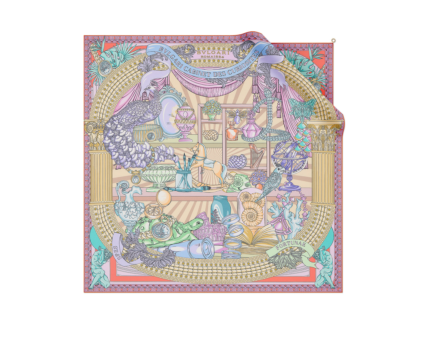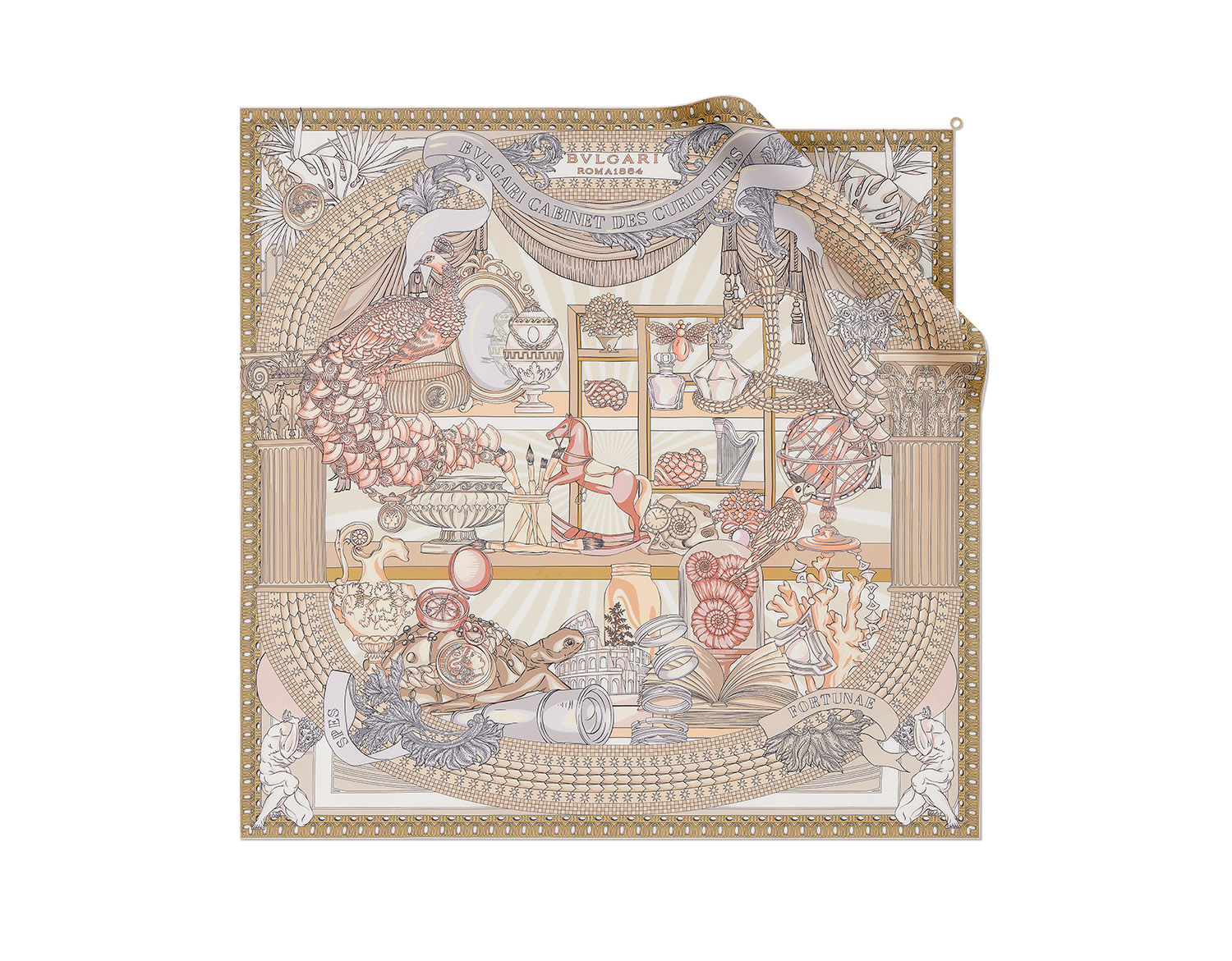 Линия Divas’ Dream расширяется за счёт новых форм. Сумка Marquise с овальным куполообразным силуэтом отсылает к одноимённой огранке, а клатч Ginkgo строится вокруг чистой графики мотива Calla, усиленной кристаллами. Текстильная линия вводит принт Cabinet des Curiosités — своеобразный визуальный архив Дома. Здесь знаковые символы Bvlgari складываются в композицию, напоминающую «кабинет редкостей». Шёлковые платки, произведённые в Комо, завершают коллекцию на более лёгкой, но концептуально цельной ноте.