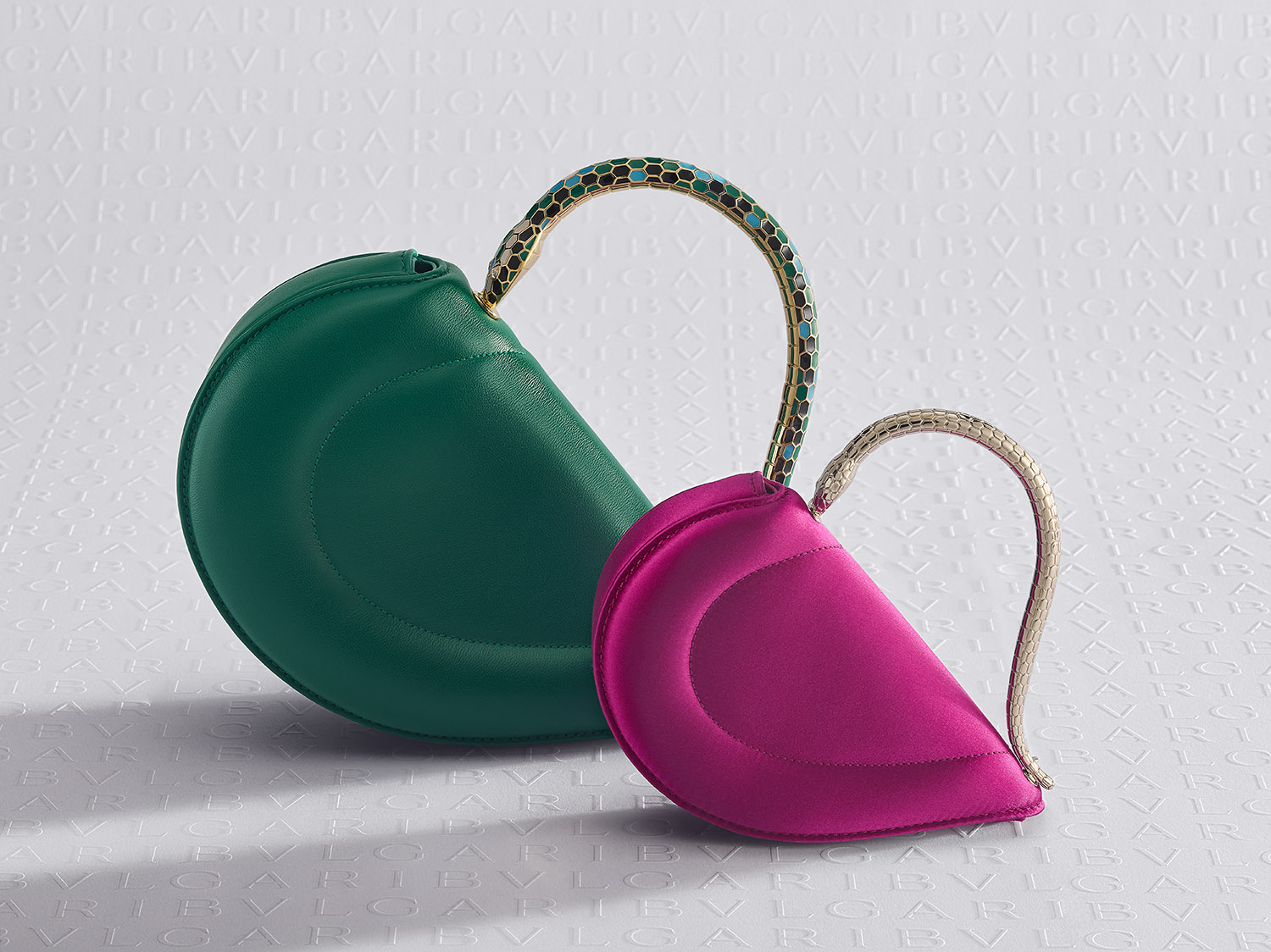 Линия Serpenti остаётся центром коллекции и развивается сразу в нескольких направлениях. Модель Serpenti Cuore “1968” превращает архивный мотив в скульптурное сердце, где металлическая ручка-змея с эмалью становится главным акцентом. Миниатюрная Cuoricino усиливает идею «сумки-украшения» — особенно в версии с почти пятью тысячами вручную закреплённых кристаллов.